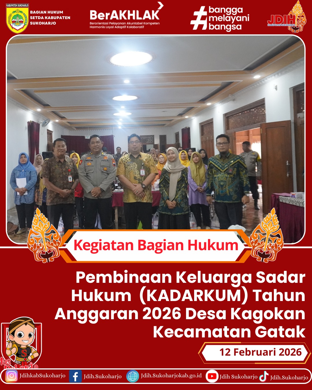 Kunjungan kerja dalam rangka monitoring pelaksanaan pengharmonisasian produk hukum daerah, pengelolaan Jaringan Dokumentasi dan Informasi Hukum (JDIH), serta pelaporan kinerja JDIH Tahun 2025 dilaksanakan di Kabupaten Sukoharjo. Kegiatan ini menjadi bagian dari upaya penguatan tata kelola regulasi daerah agar selaras dengan peraturan perundang-undangan yang lebih tinggi serta mendukung terciptanya sistem dokumentasi dan informasi hukum yang tertib, akurat, dan mudah diakses oleh masyarakat.Kegiatan kunjungan kerja ini dipimpin oleh Kadiv Peraturan Perundang-undangan dan Pembinaan Hukum Delmawati, SH.MH. diterima langsung oleh Kepala Bagian Hukum Retno Widiyanti B. SH. pada hari Rabu, 11 Februari 2026 di ruang Rapat Kepala Bagian Hukum Setda Kabupaten Sukoharjo.