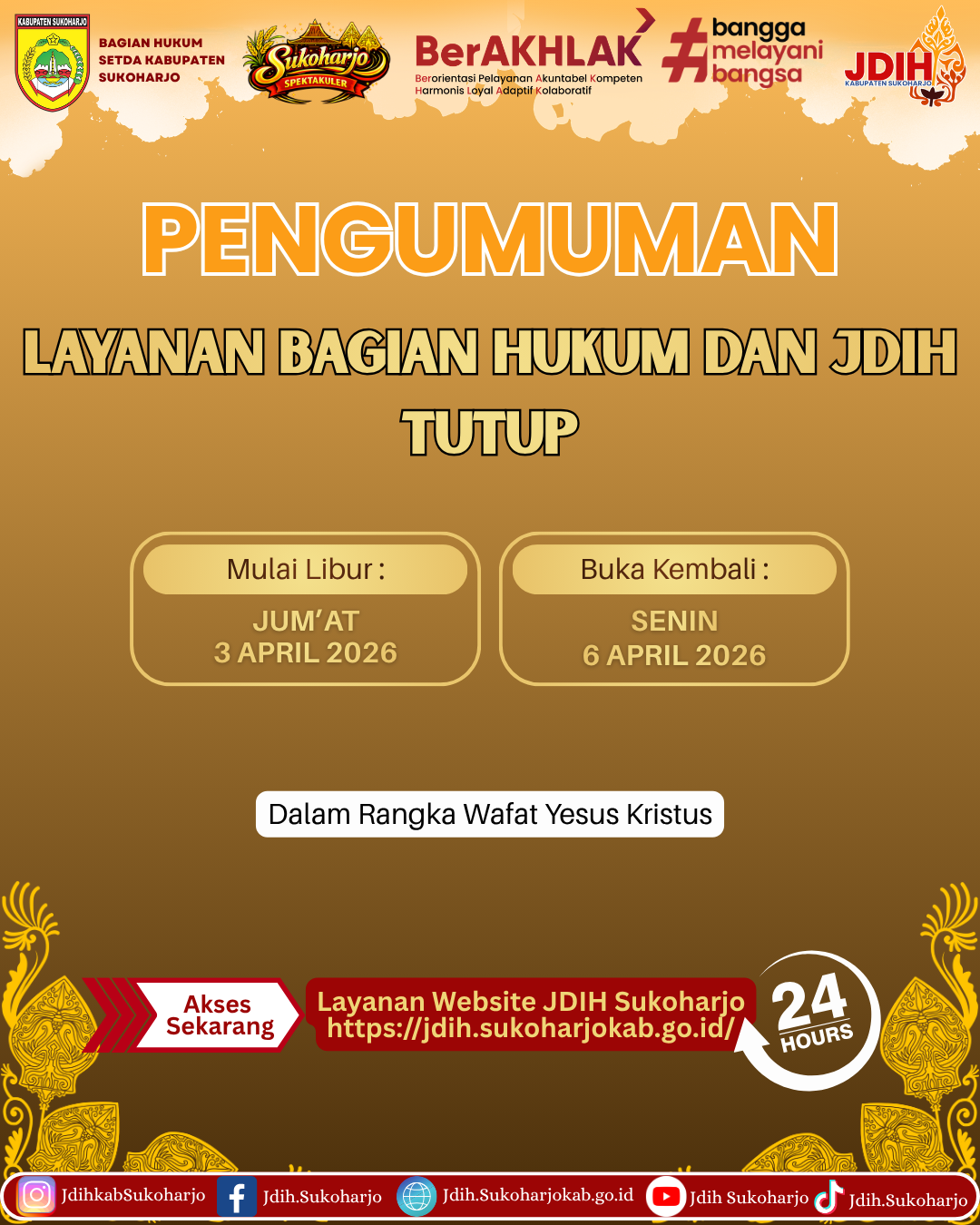 Bagian Hukum Setda Kabupaten Sukoharjo dan JDIH Kabupaten Sukoharjo mengucapkan Selamat Bertugas kepada Komjen Pol (P) Drs. Ahmad Luthfi, S.H., S.STt M.K. dan Taj Yasin Maimoen sebagai Gubernur dan Wakil Gubernur Provinsi Jawa Tengah periode 2025 - 2030.Semoga amanah yang diberikan dapat dijalankan dengan penuh tanggung jawab, keikhlasan, dan dedikasi tinggi untuk kemajuan daerah serta kesejahteraan masyarakat.
